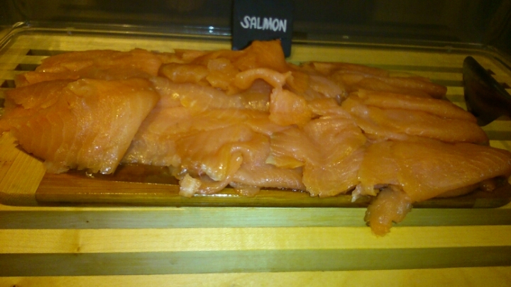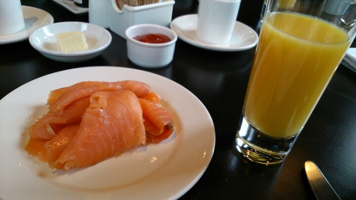 美味しいスモークサーモンを沢山食べ、オレンジジュースを沢山のみ、大満足のジェームスでした。。。![]()
