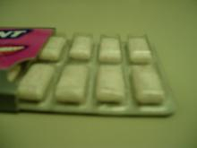 ガムの粒にピンクのテンテンが.....