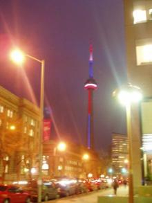 クリスマスシーズンのトロントは街のシンボルのCNタワーもクリスマスカラー